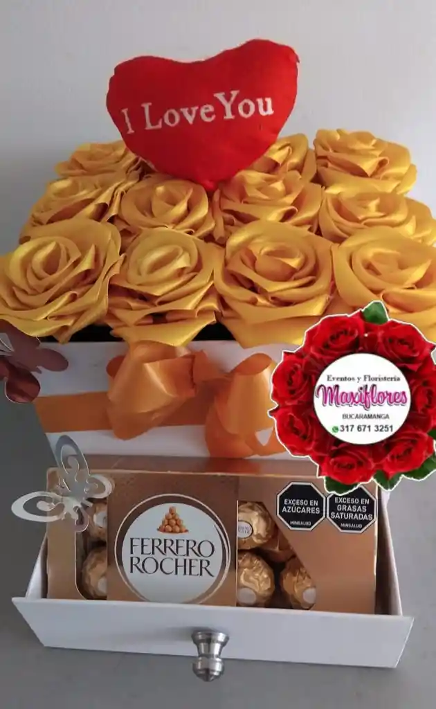 caja blanca gabetera rosas preservadas amarilas + chococolates