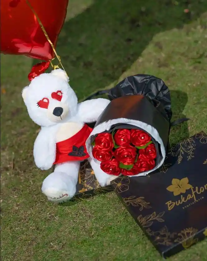 ¡¡Bukkiteddy se hizo peluche!!, ahora llevamos un amor para siempre con las flores de moda llamadas flores eternas realizadas en cinta de lazzo petalo a petalo, por nuestras mujeres apasionadas por el amor. Bukaflor siempre es tu cómplice del amor... Contiene: Bouquet en flores Eternas (Te puede llegar todo rojo o en colores surtidos, según disponibilidad) Peluche Bukkiteddy ( Carlotta, un amor para siempre) Kit * 3 Globos en helio corazon. Tarjeta Gratis