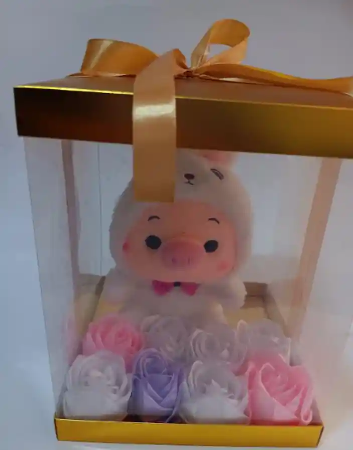 cajita cerdito rosas contiene caja acetato transparente con moño dorado 20cmx 20cm x 26cm peluche de 20cm 10 rosas en cinta en colores pasteles