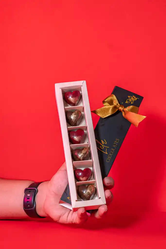 Delicada Caja de chocolates rellenos elaborados con chocolate al 58% selecto de origen colombiano endulzado con mantitol, rellenos de distintos sabores frutales que destacan nuestra tradición colombiana Mora endulzado con Stevia Arequipe sin Azúcar. hermosa caja de 24.5cms * 5.5cm decorada con moño en cinta tela.