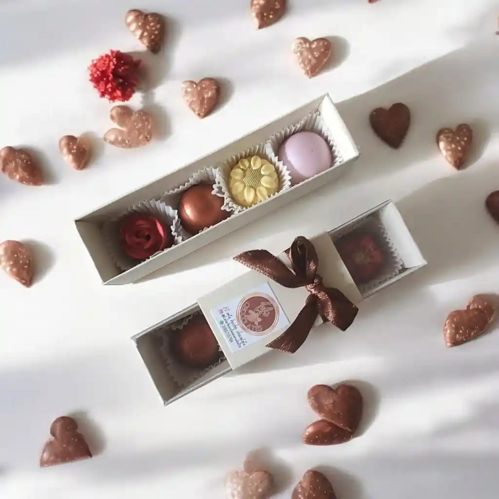 Caja *4unid de Bombones de Chocolate rellenos de : *Mora *Vainilla * Frutos Rojos (mezcla de fresa, cereza y mora) * Frutos Amarillos (mezcla de maracuyá, mango y piña)