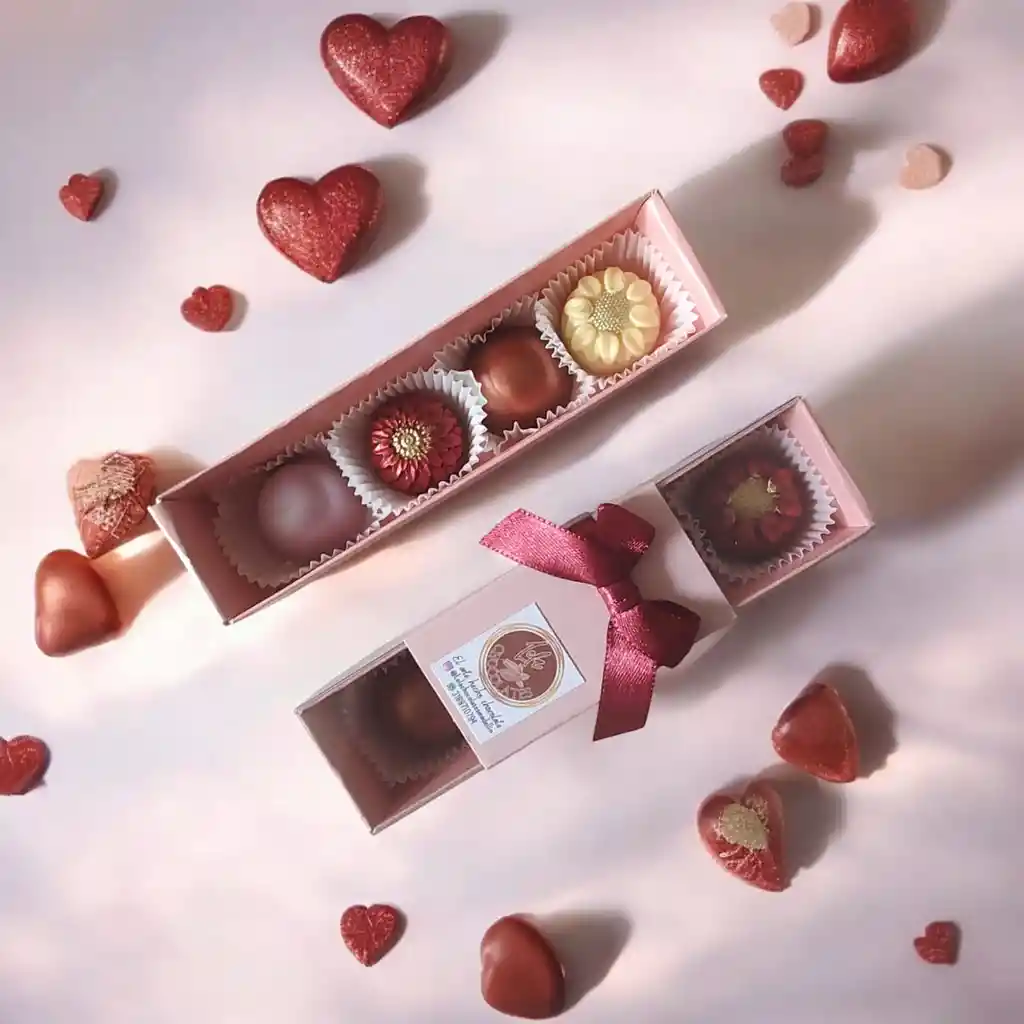 Caja *4unid de Bombones de Chocolate rellenos de : *Mora *Vainilla * Frutos Rojos (mezcla de fresa, cereza y mora) * Frutos Amarillos (mezcla de maracuyá, mango y piña)