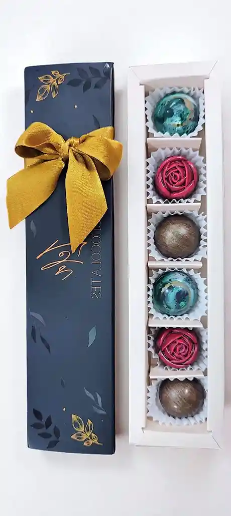 Delicada Caja de chocolates rellenos elaborados con distintos tipos de chocolates selectos de origen colombiano, rellenos de distintos sabores frutales que destacan nuestra tradicion colombiana Esta caja incluye 6 bombones de sabores los siguientes sabores de 3cm de diámetro en hermosa caja de 24.5cms * 5.5cm 2 Chocolate amargo al 70% malteada de fresa 2 Chocolate amargo al 70% crema de café 2 Chocolate semiamargo al 53% nutella y mora