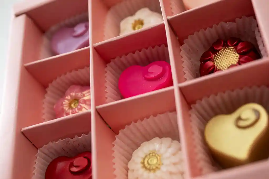 Caja de Chocolates * 9 bombones en forma de diferentes flores y corazones de rellenos surtidos como: Frutos rojos Arequipe Durazno Coco Fresa Decorada con Moño en cinta tela.