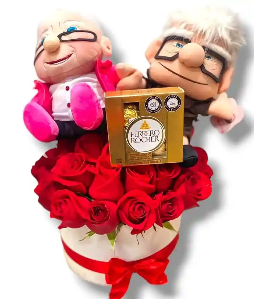 Cilindro con 20 rosas ( 8 de marzo se envía color según disponibilidad), pareja de viejitos Up (pequeños), caja de chocolates por 4 unidades Ferrero Rocher. tarjeta con mensaje personalizado