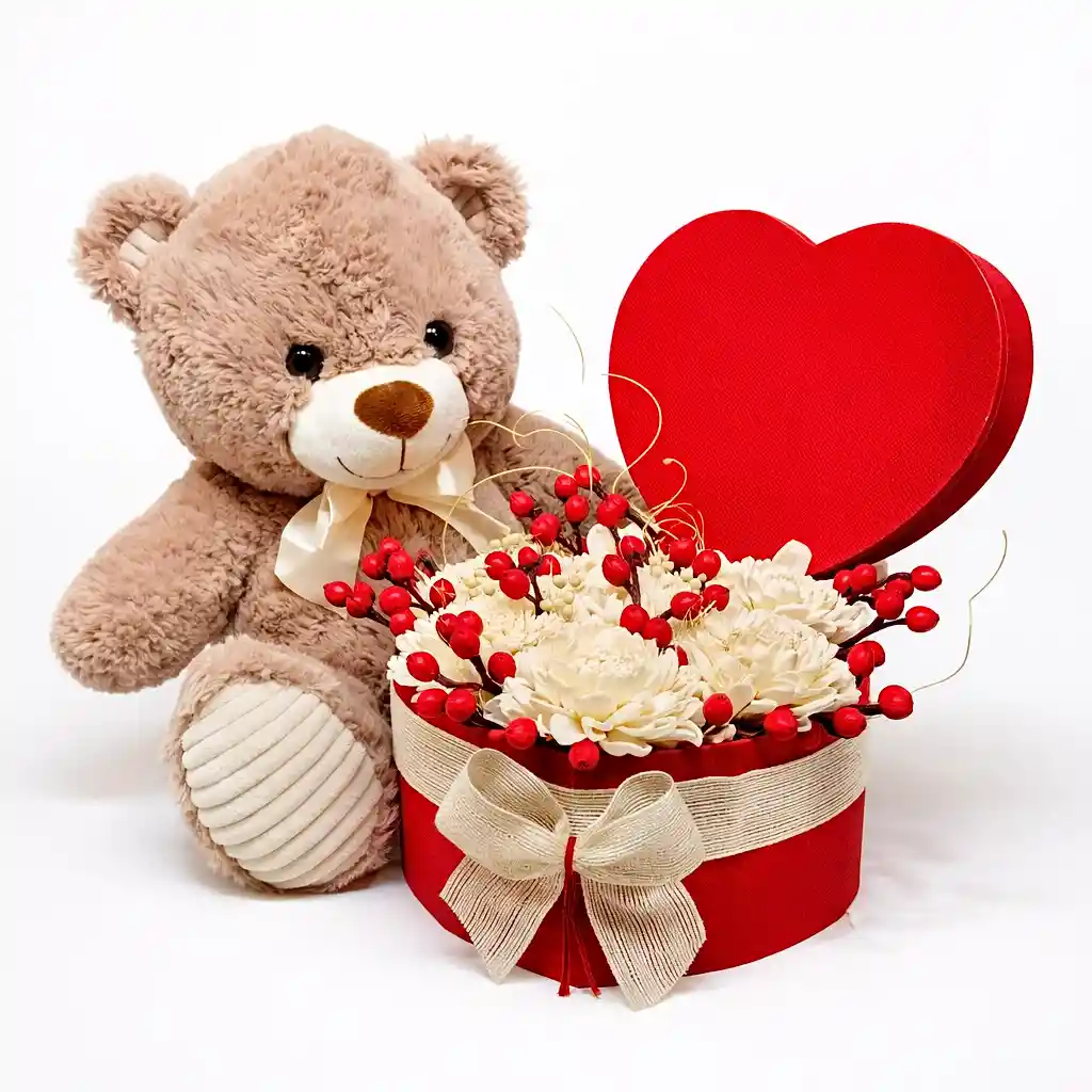 Rojo: Un detalle que enamora a primera vista. Creado para expresar amor, ternura y sofisticación en cualquier ocasión especial. Creado con flores únicas, fabricadas a mano en corteza de madera natural.