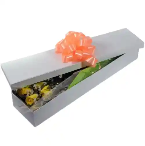 Caja Contiene 18 Rosas Amarillas. Decorada con Follaje, Papel y Moño