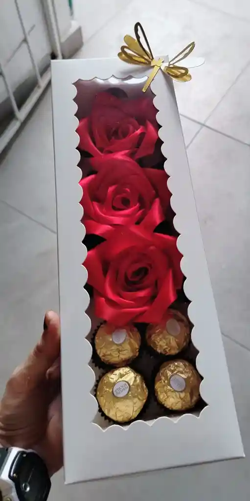 Caja blanca con ventana con bombones de chocolate y rosas rojas preservadas