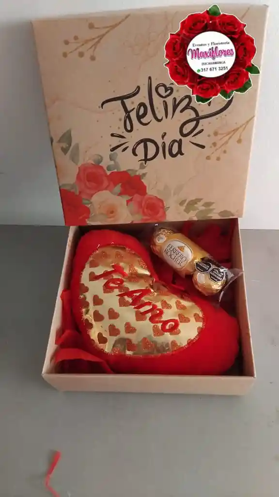 CAJA CON CORAZON TE AMO CON CORAZONCITOS AMARILLOS Y CHOCOLATES 3 UNIDADES