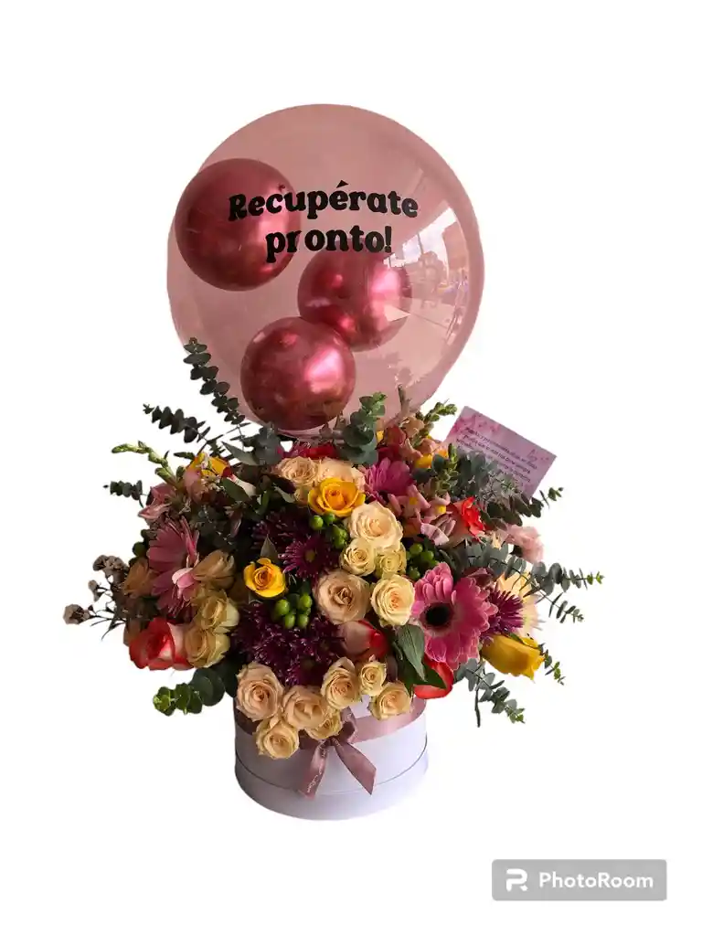 Caja de cartón rígido (color y forma según disponibilidad) con flores en colores vivos, incluye burbuja con mensaje personalizado y globos combinables con el color de la flor! Moño en tela y tarjeta