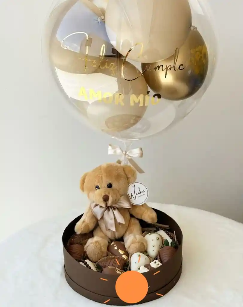 Caja decorativa con 10 unidades de fresas con chocolate, oso de peluche - mediano 20 - 25 cms, globo burbuja con mensaje personalizado: feliz cumpleaños, te amo. ( realizar pedido con 3 horas de anticipación)