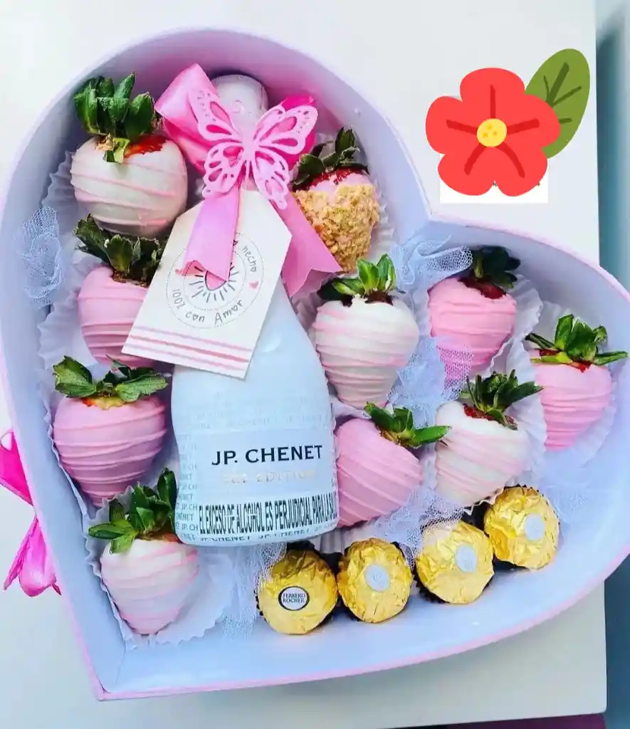 Caja corazon con 10 unidades de fresas con chocolate, champaña JP 300ml, 4 unidades de Ferrero Rocher, (realizar pedido minino con 3 horas de anticipación), tarjeta con mensaje personalizado: déjalo en los comentarios o en el chat