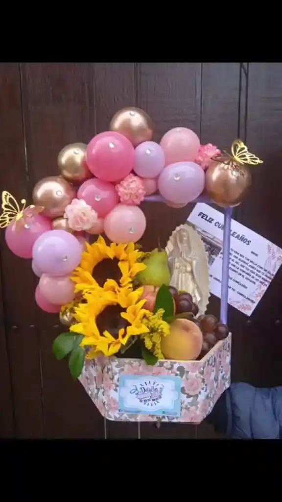 Caja con girasoles, virgen de 16cm manzana verde, manzana roja, uvas rojas, melocotón y pera, decorada con mini arco de globos. Y tarjeta con