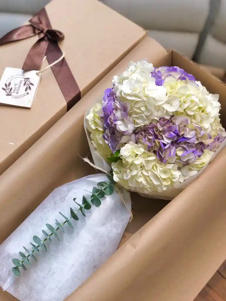 Caja con hortensias surtidas, instrucciones de cuidado, alimento para la flor y tarjeta personalizada