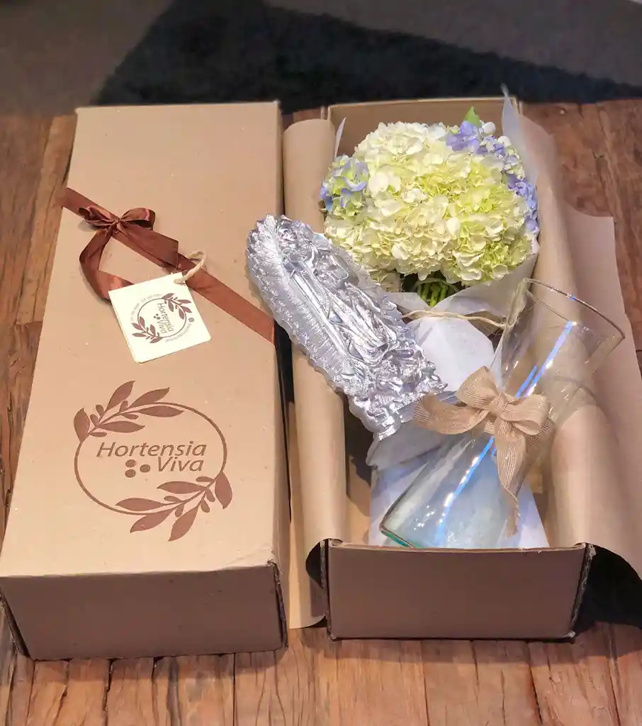Caja con hortensias surtidas, virgen de Guadalupe, jarrón, instrucciones de cuidado, alimento para la flor y tarjeta personalizada