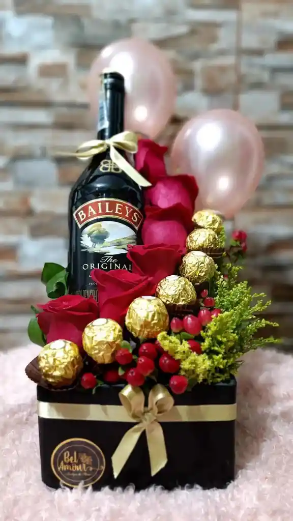 Caja con 14 rosas, 7 chocolates ferrero con botella de crema de whisky Baileys y dos globos mini chromados.