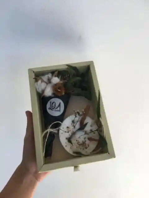 Caja que contiene aromatizante en cera de soya con olor y flores mas mini bouquet. ideal para detalles corporativos y agradecimiento