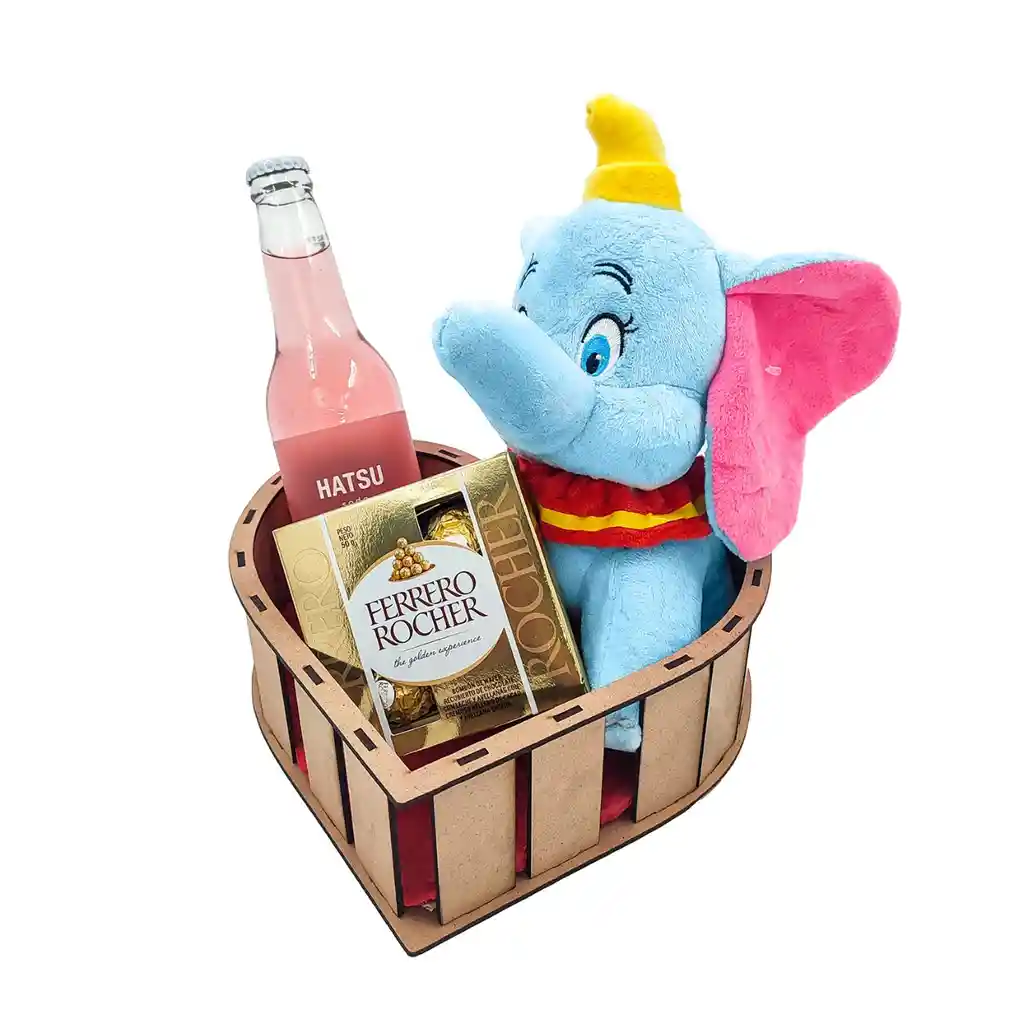 Caja de carton con peluche de felpa, te hatsu rosa y caja de chocolate de 6 unidades