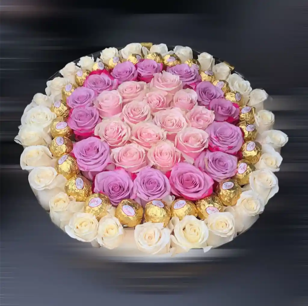 Caja de cartón rígido (forma y color según disponibilidad) con 54 rosas (color según disponibilidad) y 30 chocolates de avellana (tipo ferrero)