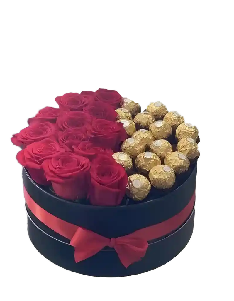 Caja redonda pequeña, lleva 15 rosas rojas, 18 chocolates Ferrero Rocher y tarjeta personalizada si el cliente lo desea. Ideal para regalar en cualquier ocación