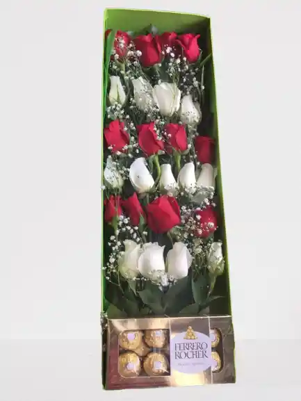 Caja con 25 rosas blancas y rojas junto con caja de Ferrero 8 unidades, sellada con un moño decorativo