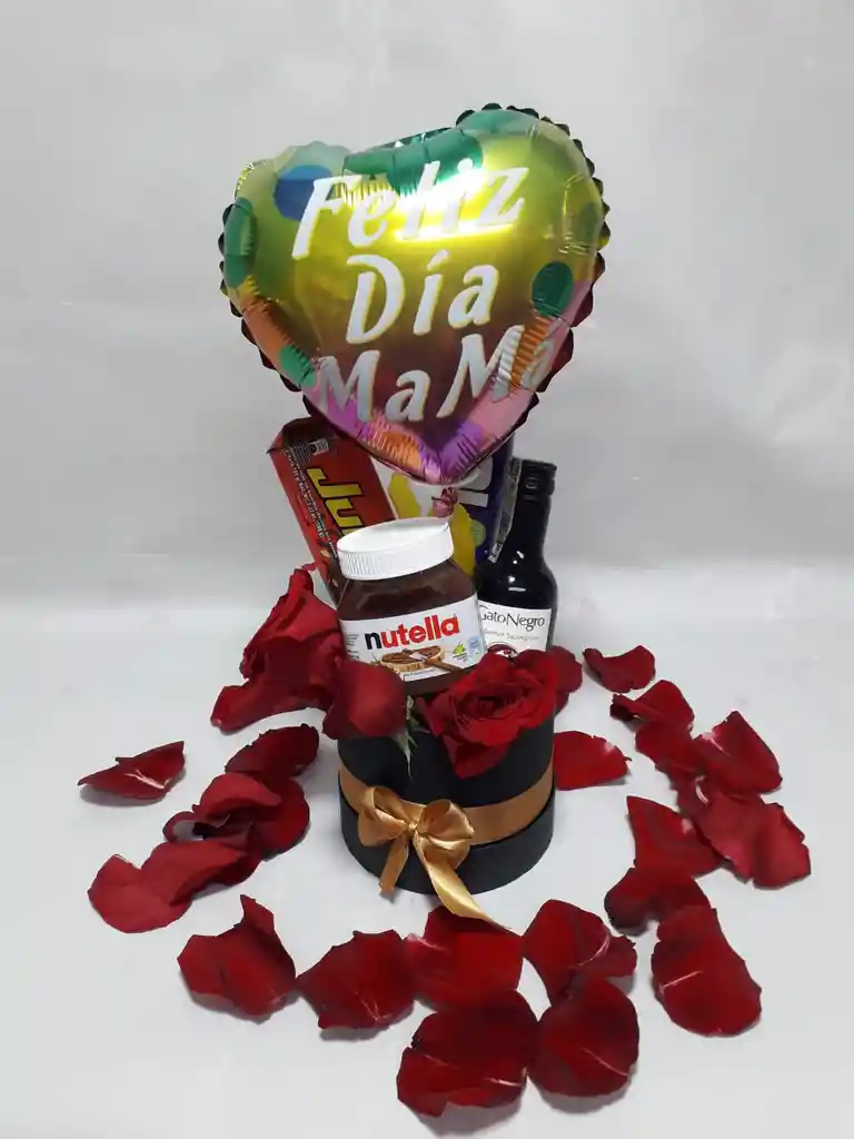 Caja con vino gato negro pequeño con chocolata y nutela mas bomba depende la ocacion