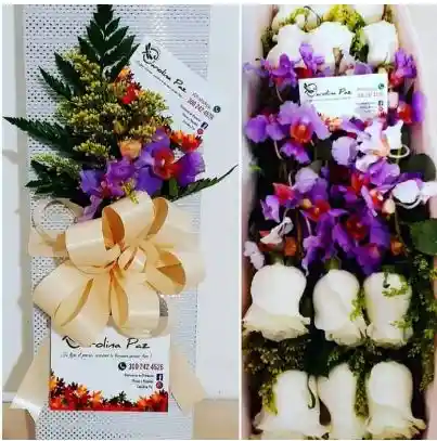 Arreglo floral en caja de cartón elaborado con rosas orquídeas y follajes en tonos blancos y lila acompañado de cinta y tarjeta de condolencia.