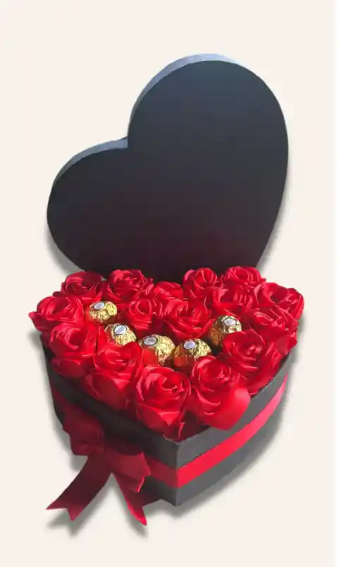 Caja en forma de corazón 23 Cm de ancho, diseñada en cartón industrial de 1.5 Mm con tapa rígida y sticker de elección, contiene de 16 a 20 rosas rojas elaboradas a mano con cinta sanitanada, 5 chocolates ferrero rocher, cinta y moño decorativo.