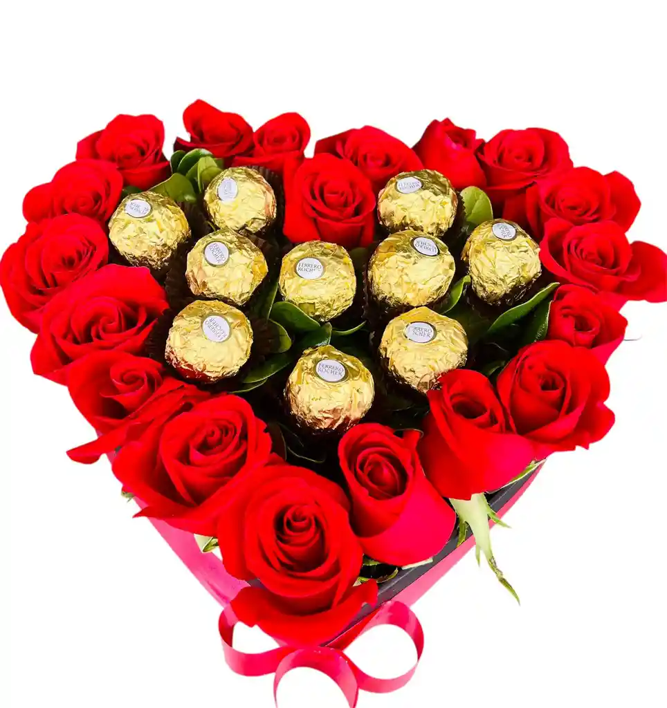 Arreglo floral x20 rosas tipo exportación en tonalidad rojo Chocolates ferrero rocher x10 unidades Follaje fino brillantina Moño en satín rojo Diseño elaborado en caja de cartón troquelado 20x20 en forma de corazón negra