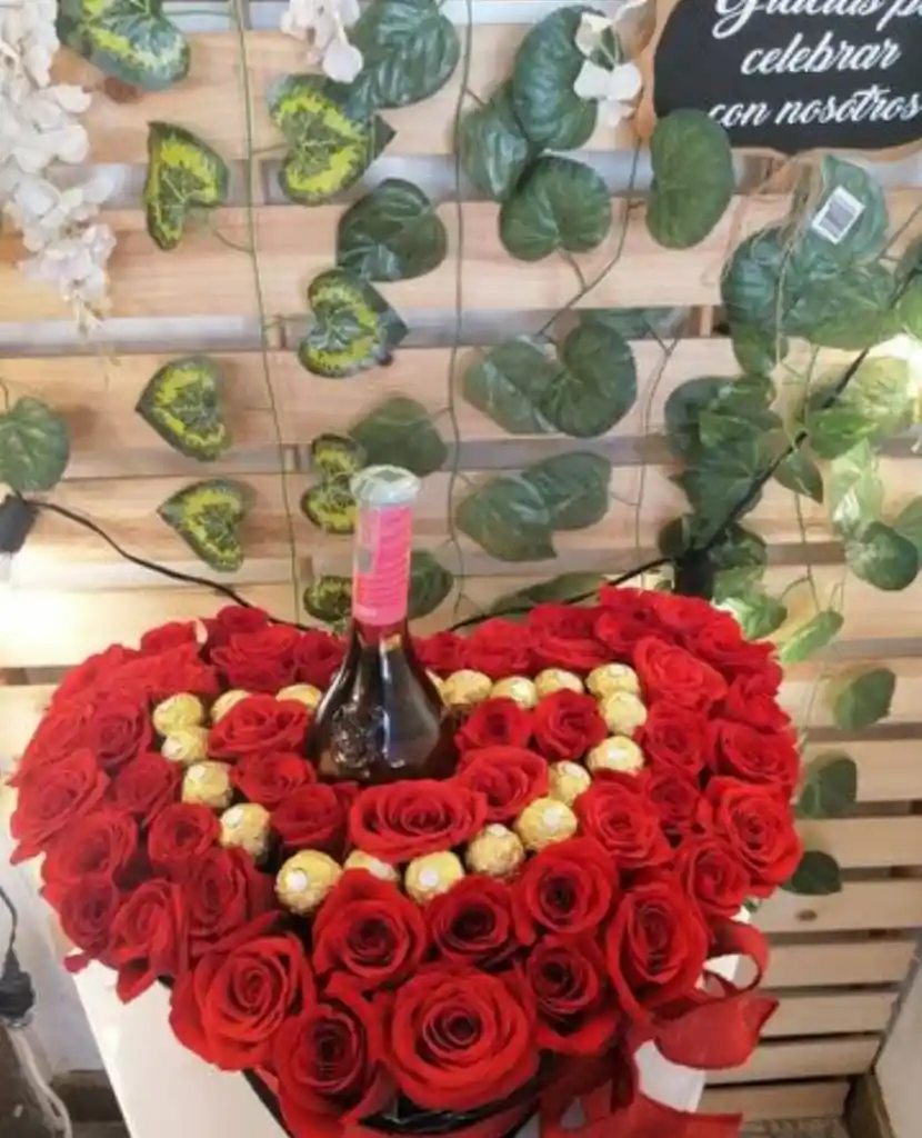 Caja corazón 60 rosas luxxury con férrero y licor