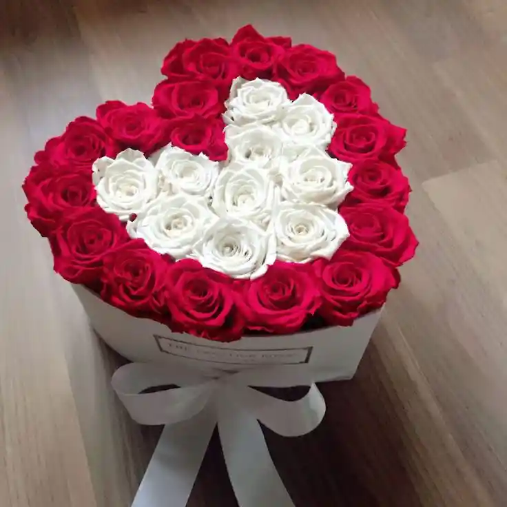 Un corazón hecho de rosas que late por quien lo recibe. La intensidad del rojo declara pasión profunda, mientras el blanco susurra pureza y lealtad verdadera. Este diseño en forma de corazón, elaborado con rosas premium cuidadosamente seleccionadas y una presentación de lujo con lazo satinado, es una pieza de alto impacto visual pensada para provocar emoción inmediata. Ideal para aniversarios, propuestas, San Valentín, cumpleaños románticos o cualquier momento que merezca ser inolvidable. No es solo un arreglo floral, es una declaración impecable de amor, elegancia y buen gusto.
