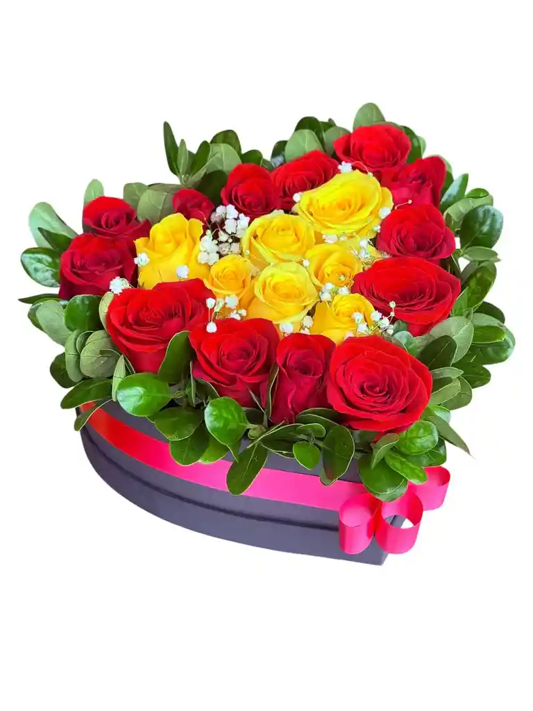 Arreglo floral x 20 rosas tipo exportación en tonos amarillo y rojo naturales Diseño elaborado en una caja troquelada en forma de corazón color negro Follaje fino gipsófila, brillantina Moño en satín rojo