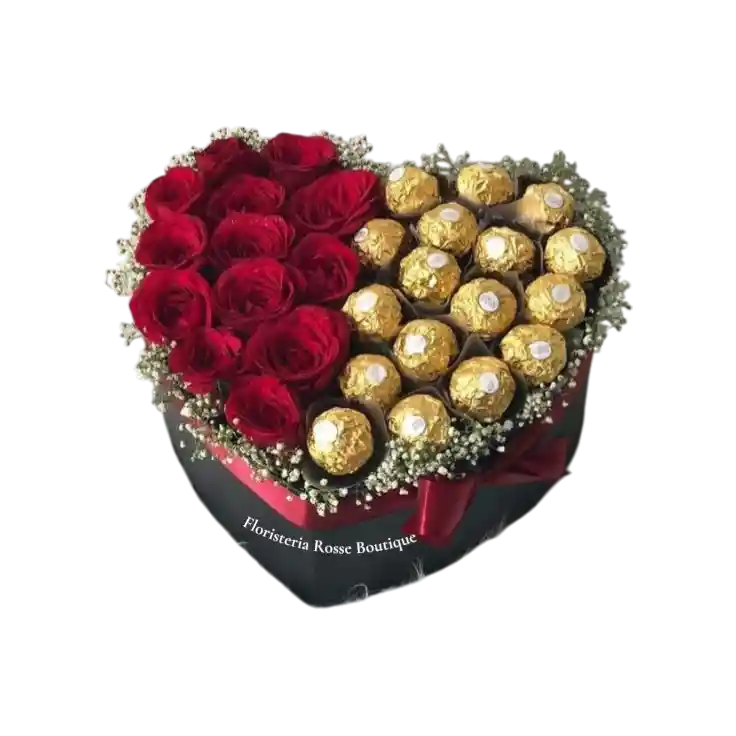 Elegante caja en forma de corazón con 15 rosas rojas frescas y 15 deliciosos chocolates, cuidadosamente organizados para crear un detalle romántico, impactante y perfecto para sorprender en aniversarios, cumpleaños o momentos especiales.