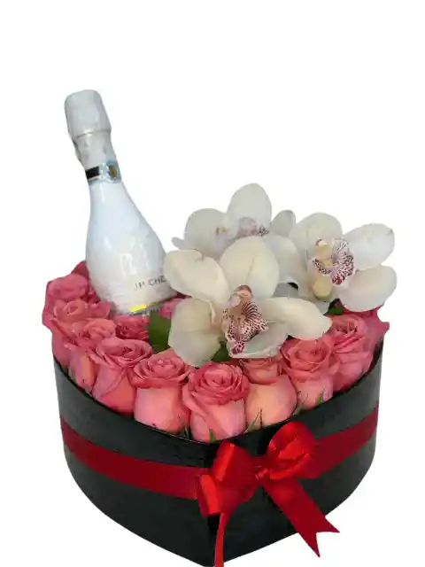 Caja en forma de corazón con rosas rosadas frescas, lirios blancos y una botella de JP. Un arreglo delicado, elegante y perfecto para sorprender con un detalle romántico y especial. Ideal para cumpleaños, aniversarios o para expresar amor de una forma inolvidable.