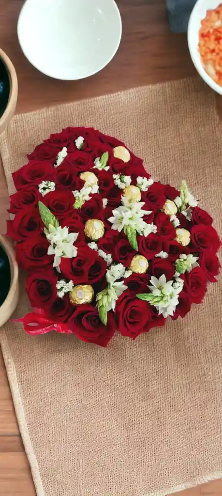 Caja de carton liso grueso con rosas rosas Follajes y rellenos de Chocolates Ferrero Rocher, viene con su tapa y moño al cerrar