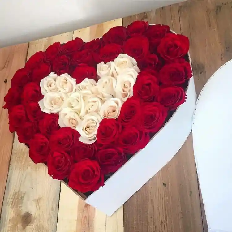 caja en forma de corazón con rosas rojas y blancas
