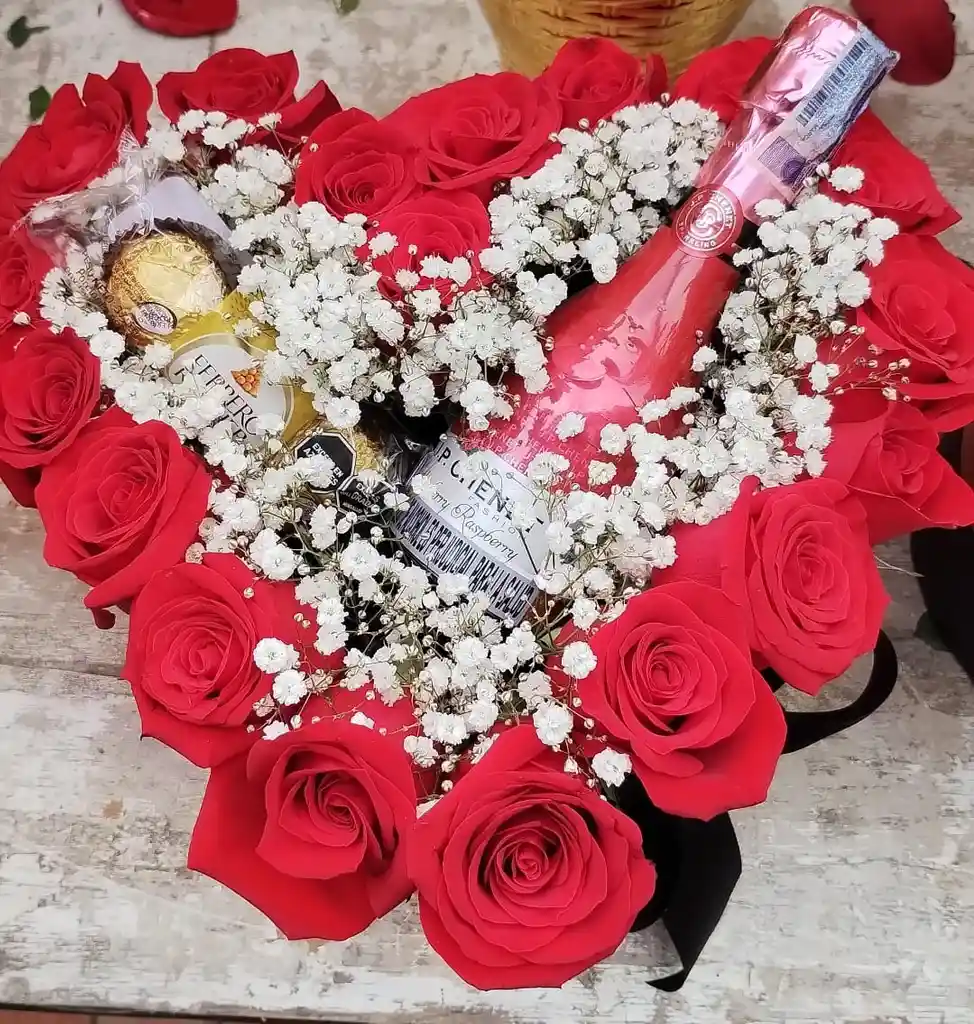 Hermosa caja en forma de corazón de rosas naturales. Incluye: 22 rosas, 1 champaña JP Chenet 200ml, chocolates ferrero x3, follaje, caja en forma de corazón de lujo, moño y tarjeta. *Por alta demanda el color de las rosas y decoración pueden variar, colores sujetos a disponibilidad* Te recomendamos programar tu pedido con anticipación, teniendo en cuenta los horarios establecidos.