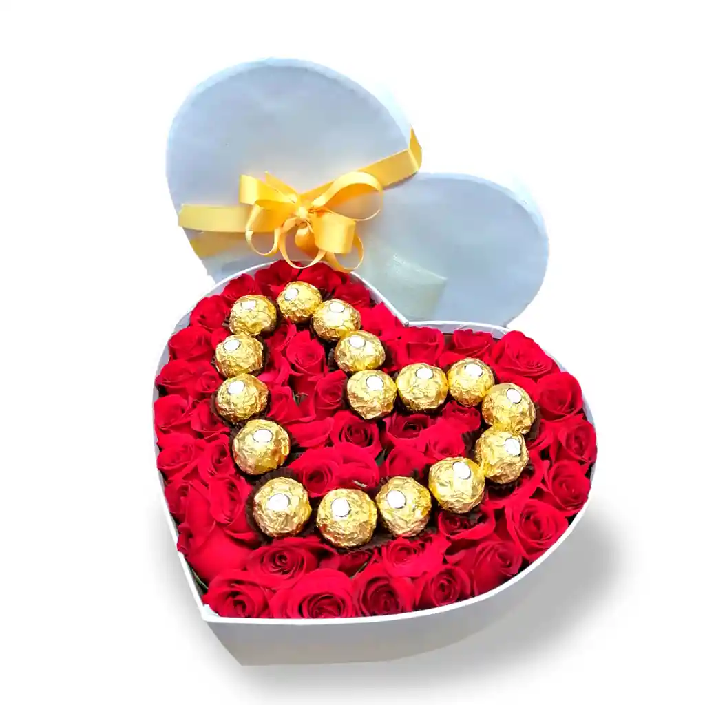 Caja de rosas con chocolates en forma de corazón ideal para sorprender a esa persona importante para ti demostrándole lo mucho que la quieres Flores Rosas Blancas y RojasForma CorazónBase Cartón Piedra Forrado BlancoTamaño 35cm de Ancho x 30cm de AltoCinta de Moño Tela DoradaCantidad de Flores 50 RosasChocolates Caja de chocolates Ferrero Rocher x 16 Unidades