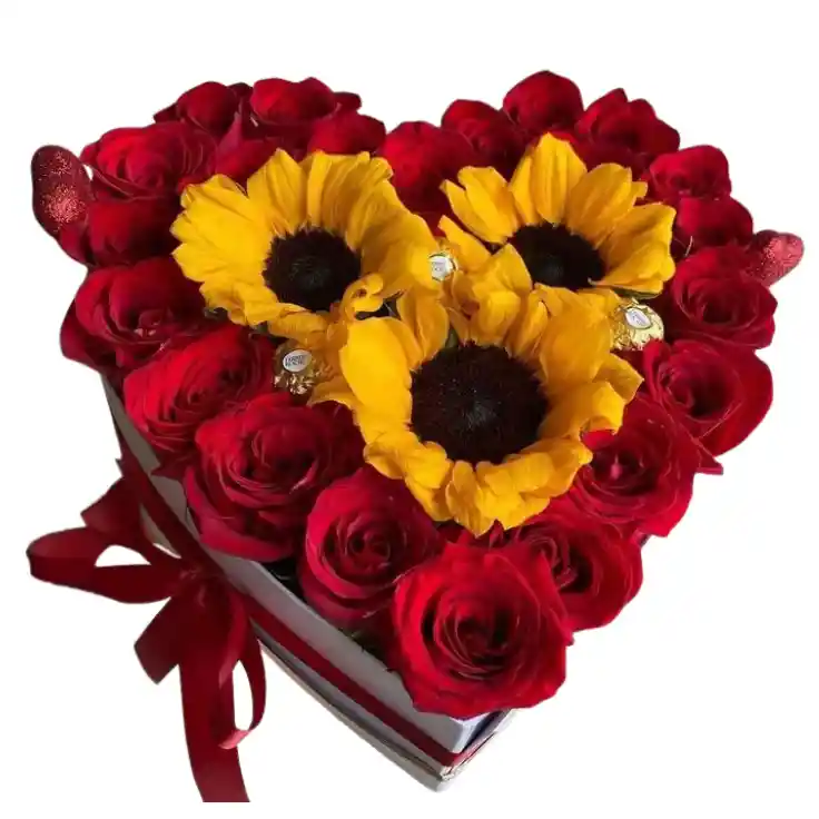 Caja de corazón con rosas, girasoles y chocolates Un hermoso diseño en forma de corazón que combina 6 a 8 girasoles, 12 rosas y deliciosos chocolates, ideal para sorprender con un detalle vibrante y dulce. Nota: La flor puede ser sustituida dependiendo de la disponibilidad de color y del producto. "Mensaje Personalizado" máximo de 30 caracteres (Dejar el mensaje en el chat, los comentarios no se previsualizan para la tienda, por lo que si se dejan allí no podrá ser incluido).
