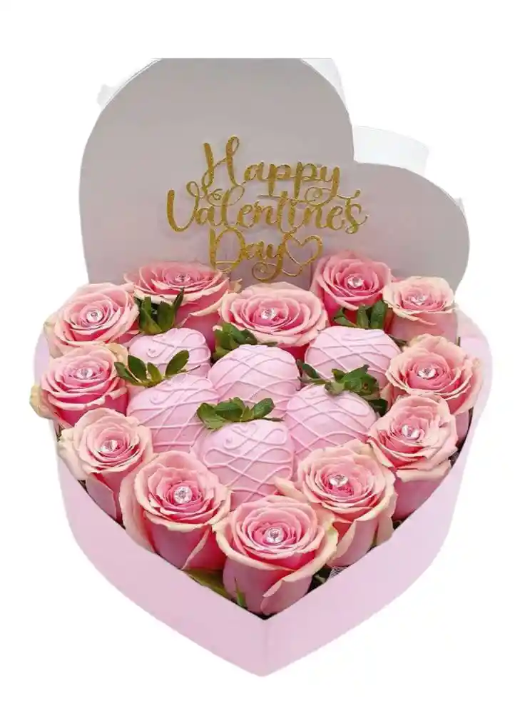 12 ROSAS 6 FRESAS DECORACION CAJA ROSA O BLANCA CORAZON MENSAJE UNICAMENTE SE VE POR EL CHAT .