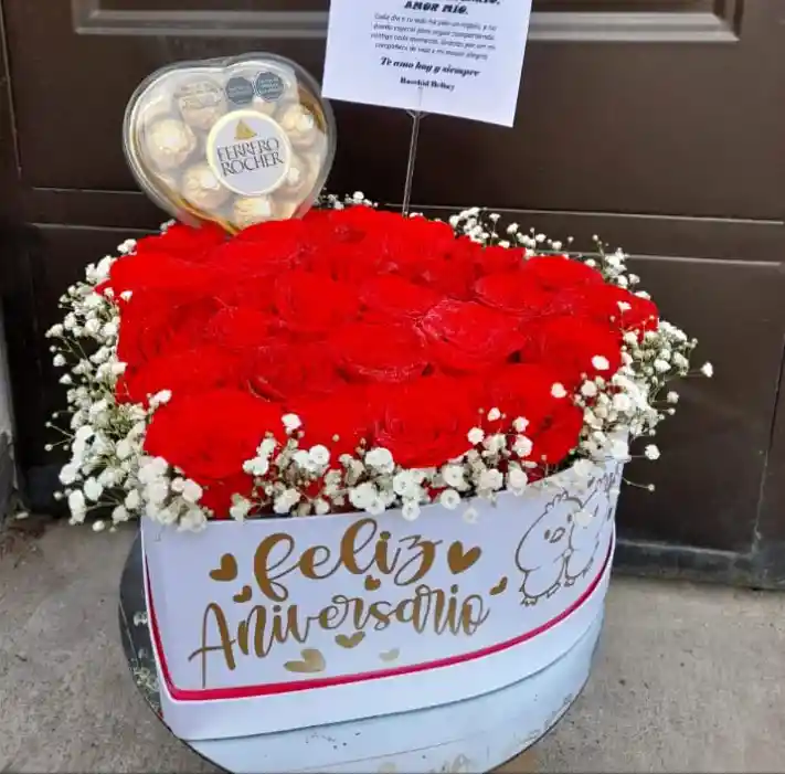 arreglo floral elaborado en caja de cartón en forma de corazón con rosas y acompañado de chocolates