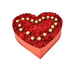 Caja en forma de corazon con aprox. 50 rosas rojas ,acompañadas de 20 chocolates. La flor puede ser sustituida dependiendo la disponibilidad de color y del producto “Mensaje Personalizado” máximo de 30 caracteres (Dejar el mensaje en el chat, los comentarios no se previsualizan para la tienda por lo que si se dejan allí no podrá ser incluido)