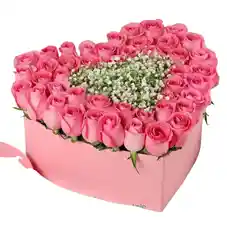 Caja en forma de corazón con 40 rosas rosadas y gypsophila Nota: La flor puede ser sustituida dependiendo la disponibilidad de color y del producto “Mensaje Personalizado” máximo de 30 caracteres (Dejar el mensaje en el chat, los comentarios no se previsualizan para la tienda por lo que si se dejan allí no podrá ser incluido).