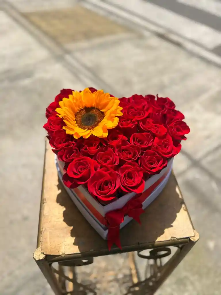 caja con 24 rosas naturales ademas de un girasol grande que resalta en el diseño