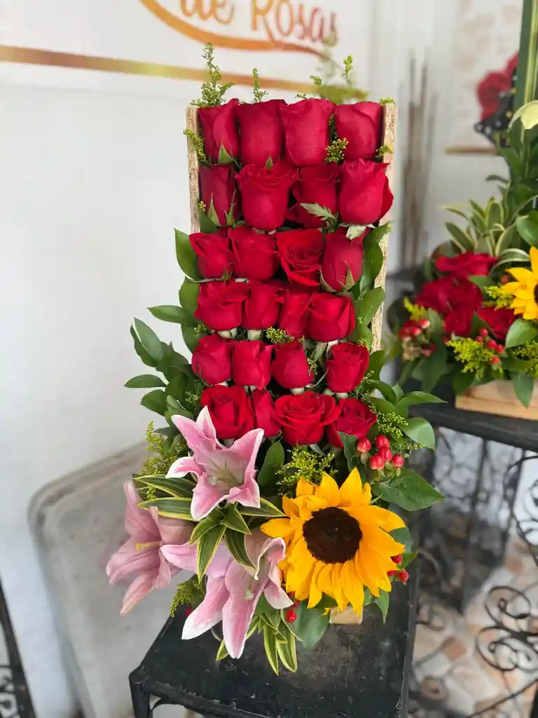 Caja corcho diseñada de rosas y lirios y girasoles