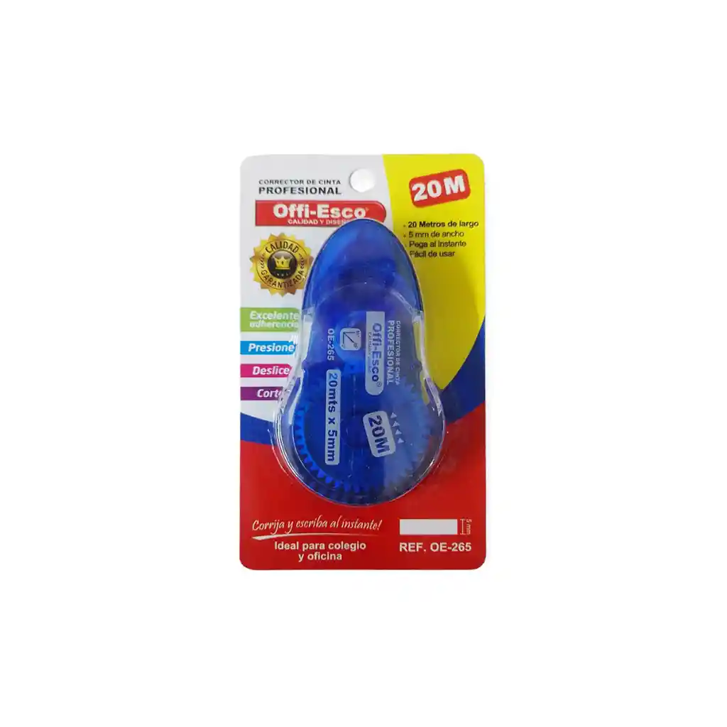 Corrector con elegante diseño, evita manchas o rayones feos en documentos redactados o trabajos escolares, una cinta blanca de fácil uso tamaño ideal para llevar en cartucheras, bolsos y morrales. CARACTERÍSTICAS CALIBRE: 5 MM CONTENIDO: 20 M COLOR DE PRODUCTO: BLANCO Contenido 12 UND DE CORRECTOR DE CINTA OFFI-ESCO 20 METROS