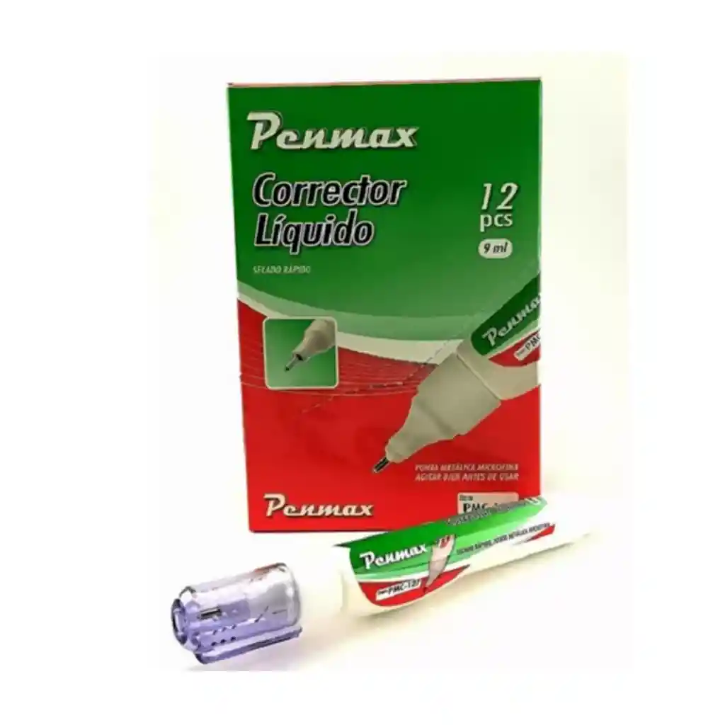 Corrector con elegante diseño, evita manchas o rayones feos en documentos redactados o trabajos escolares, una cinta blanca de fácil uso tamaño ideal para llevar en cartucheras, bolsos y morrales. CARACTERÍSTICAS CONTENIDO: 9 ML COLOR DE PRODUCTO: BLANCO Contenido 12 UND DE CORRECTOR LÍQUIDO PENMAX 9 ML