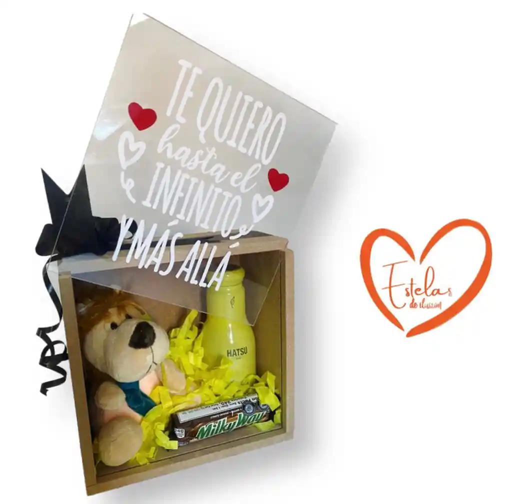 Hermosa caja de cristal en acetato con mensaje. Contiene Peluche, Té Hatsu y chocolatina MilkiWake y 1 moño.
