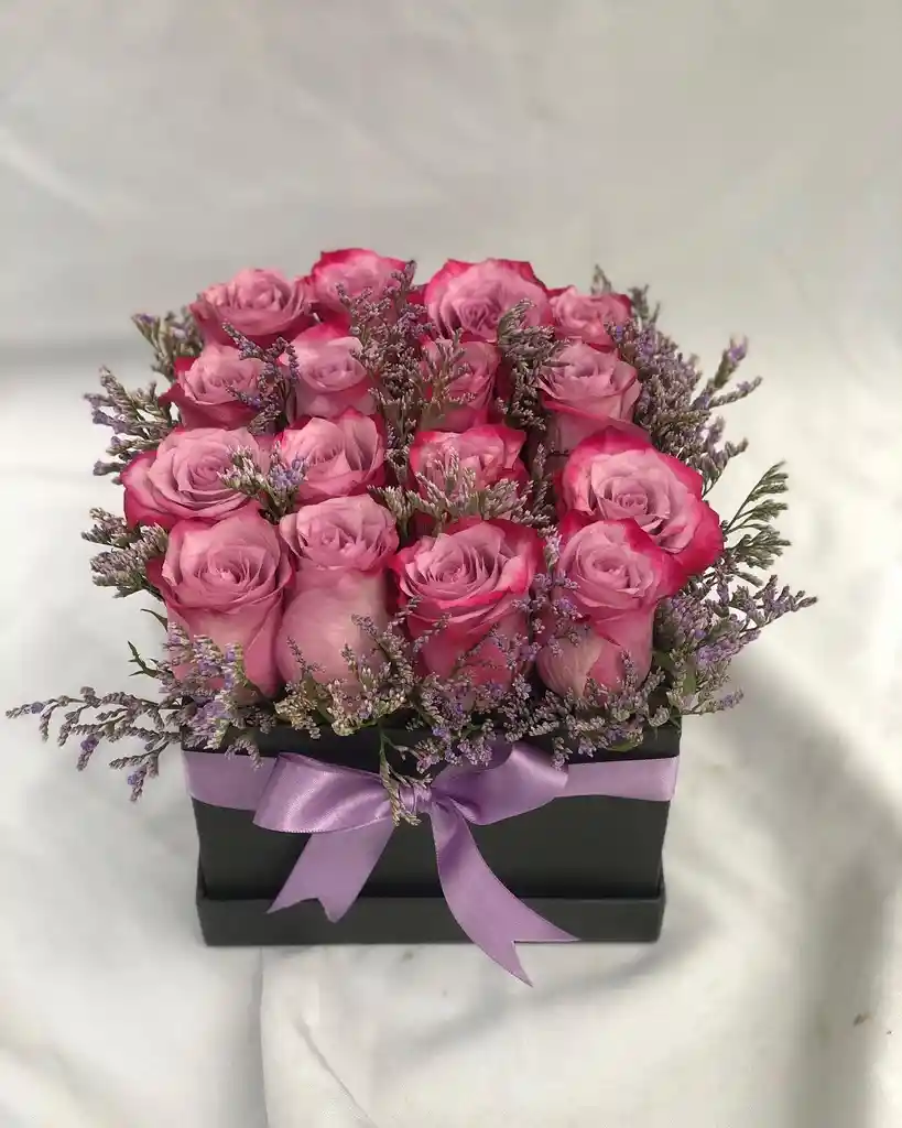 caja cuadrada negra x 16 rosas y follaje