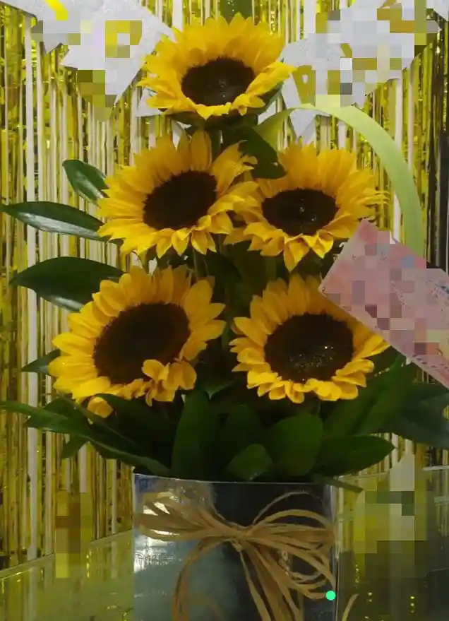 Hermosa caja de girasoles naturales. Incluye: 5 girasoles, follaje, caja de lujo, moño y tarjeta. *Por alta demanda el color de la decoración pueden variar, colores sujetos a disponibilidad* Te recomendamos programar tu pedido con anticipación, teniendo en cuenta los horarios establecidos.